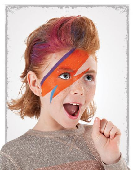 用画笔在脸上画一个橙色闪电的脸,从左边的额头沿着右眼一直到右耳;然后用紫色和蓝色加强线条。家里有染发喷雾的话,在宝贝的头发上来点蓝色与紫色也不错。