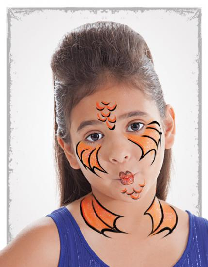 用海绵蘸橙色颜料,涂抹颧骨和脖子两侧;用画笔在橙色的脸颊上画出黑色的鳍;在额头和下巴上画出几个U形,然后用黑色勾勒轮廓;最后画一个橙色的心形嘴唇。