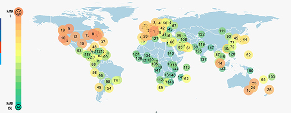 Airshare的全球150个宜居城市排名及其分布。来自于http://airshare.air-inc.com/airinc-global-150
