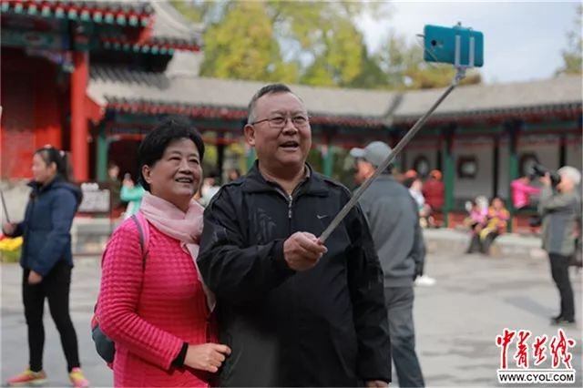 66岁的李女士和丈夫武先生来自天津,他们今天专程来到香山公园,希望度过一个难忘的重阳节。图为李女士和丈夫在致远斋前自拍合影留念。中国青年报·中青在线记者 王亦/摄