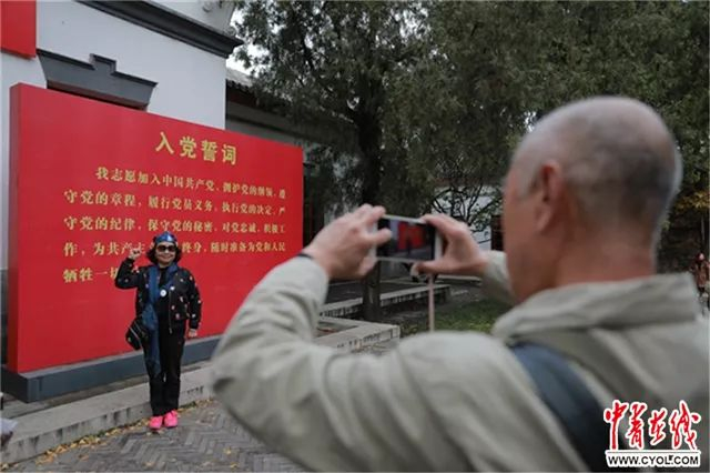在双清别墅的入党誓词前,一对夫妻正在拍摄照片。他们今年同为61岁,住在北京市门头沟区。“我老伴是共产党员,我们趁着重阳节过来拍些照片,要寄给四川老家的亲人。”老先生说,这次他是妻子的“专职摄影师”。图为在双清别墅入党誓词前拍照留念。中国青年报·中青在线记者 王亦/摄
