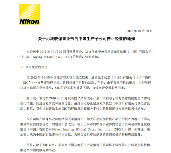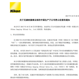 10月30日,尼康宣布,该公司当天召开董事会,决议停止子公司尼康光学仪器(中国)有限公司(Nikon Imaging (China) Co。, Ltd。)的经营。
