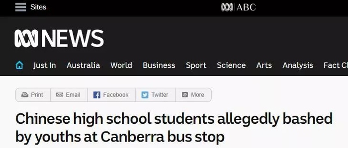 澳大利亚广播公司10月27日报道,几名在堪培拉的中国留学生近日被当地青年团伙攻击,伤势严重。