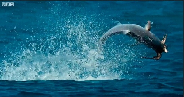 现已成为传奇人物的BBC电视制作人大卫•弗雷德里克•艾登堡爵士(Sir David Attenborough)用其惯用的吸引观众的评论和充满紧张感的背景音乐强调了这个极富戏剧性的片段。他说:“如果鲹鱼还准备再捕一只鸟,那么,它们的游戏就得升级了。这是一只在头脑中能够计算出空速和鸟的飞行高度与轨迹的鱼。”