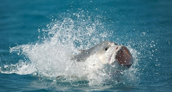 这只鲹鱼在初次捕食时,隔着几英尺与燕鸥擦肩而过,然后重回水中,但下一次就成功地通过杂技性的空中翻转技巧捕到了一只小燕鸥。据悉,这种鲹鱼可以长到5.5英尺(约1.4米)长,12英石(约76公斤)重的程度。