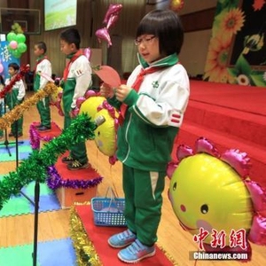 资料图:“超市购物”体验式学业成果展示在崇文小学体育馆举行,该校二年级的同学们每人拿一个小购物篮走进超市,以“购物”的形式替代传统考试。中新社发 富田 摄