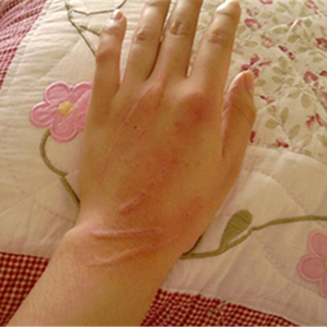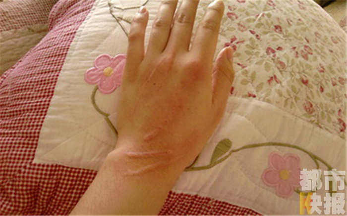 患者:“当时在沙发上看电视,小猫比较调皮,它就顺着我的手划了一道,过了十天左右,就长出了这个(肉疙瘩)。”
