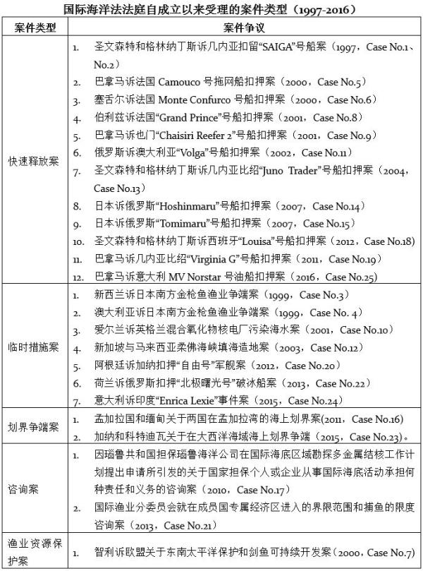 1997年11月13日,法庭受理首宗案件,即圣文森特和格林纳丁斯(中美洲加勒比海地区国家——编注)诉几内亚塞加号船(Saiga)扣押案,这是涉及沿海国的航行自由、航行船只燃油供给、专属经济区内的管辖权、海洋习惯法如何实施、海上紧追权如何实施等国际法问题的案件。该案不仅涉及对《公约》第56条、58条、62条、73条、111条、220条、226条、287条、290条、292条的解释和适用问题,还涉及国内法与国际法的协调和适用问题,法庭在谨慎依据《公约》条款和相关国内法对涉案行为综合审定后,裁决立即释放塞加号油轮及其船员。自此案以后,截止至2017年2月26日,国际海洋法法庭已经受理了25起案件。其中,13起案件涉及快速释放的案件;7起涉及临时措施适用的案件;2起划界争端案;2起咨询案;1起渔业资源保护案。