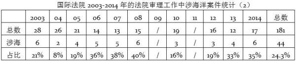 从海洋案件占国际法院案件总数的比重可以看出,海洋案件的比重较高。有时候海洋案件可能会集中爆发,所占比重甚至超过同期其他案件的总和。如1968至1977年间,涉及海洋案件占比达52.6%。另外,除了国际海洋法法庭、国际法院之外,国际常设仲裁院也一样发挥着解决海洋争端的作用。如2014年国际常设仲裁院审理的案件,除菲律宾南海仲裁院非法组成临时仲裁庭审理中国南海问题之外,其受理的其余案件,如毛里求斯诉英国在Chaos群岛周围建海洋保护区案、克罗地亚和斯洛文尼亚关于领土和海洋争端案、东帝汶诉澳大利亚《帝汶海条约》仲裁案、马耳他诉圣多美和普林西比多拉关于“Duzgit Integrity”号船舶仲裁案都与海洋问题有关,这充分说明国际司法机关落实海洋法权的实践越来越多。
