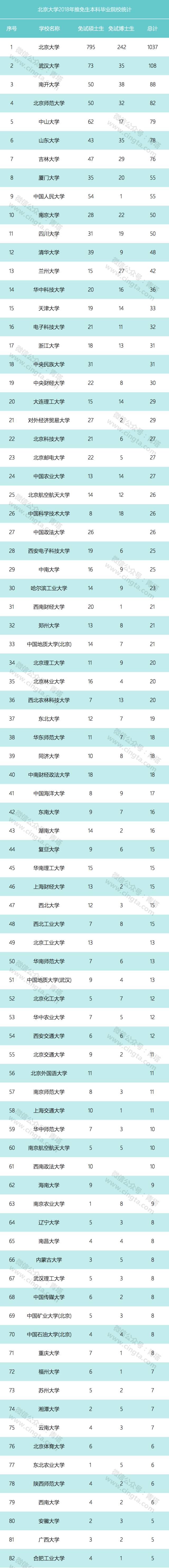 北大2018年推免生中来自北京大学本校的本科生共有1037名,占全部名额的1/3,包括免试硕士生795名和免试博士生242名。除了北大外,武汉大学入选名额达到108名,位居第二。此外,南开大学、北京师范大学、中山大学、山东大学、吉林大学、厦门大学、中国人民大学、南京大学、四川大学、清华大学、兰州大学、华中科技大学、天津大学等高校本科生较多,基本都超过了30名。