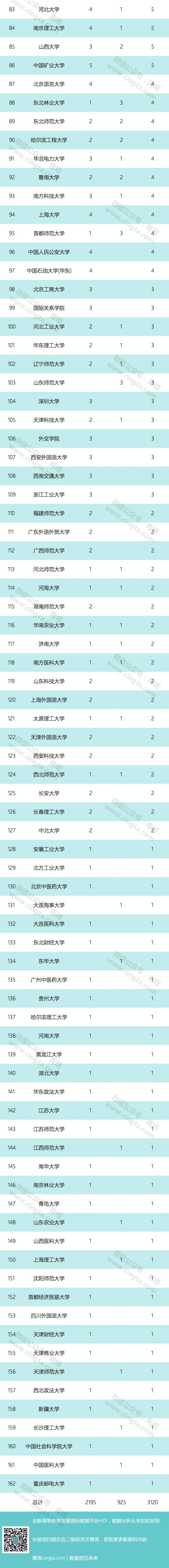 相比之下,浙江大学、上海交通大学、复旦大学等排名靠前高校的本科生较少。总体来看,大部分学子来自双一流名校,特别是位于北京的重点高校入选名额一般都较多。