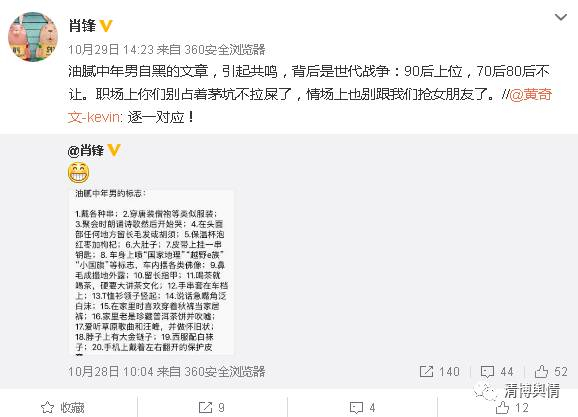在社会竞争日益激烈的背景下,为了获取更优质的社会资源,初出茅庐的年轻人与久经职场的中年人之间的矛盾凸显,正如加V用户@肖锋 所说,“油腻中年男自黑的文章,引起共鸣,背后是世代战争:90后上位,70后80后不让。”