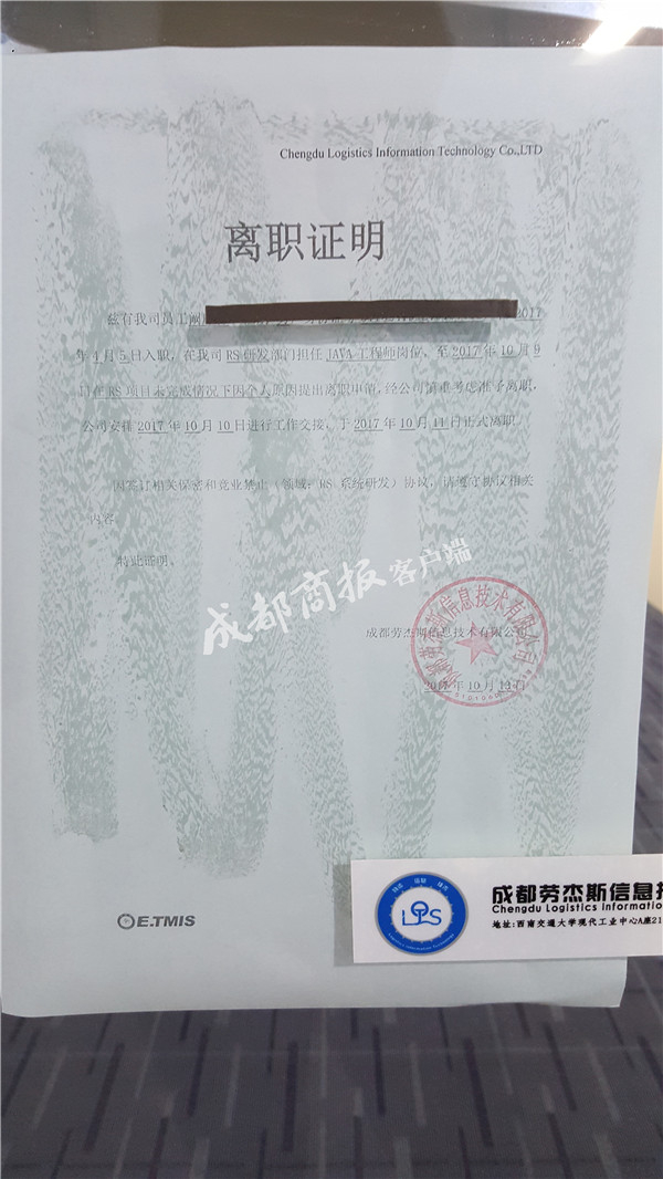 戴翔在成都交大创新大厦光谷创业咖啡孵化园的知力科技有限公司RS研发部门,担任JAVA工程师,也就是通常所说的程序员。他离职之后,公司将离职证明张贴在门口的玻璃墙上,公司以外的人均可看阅。从戴翔提供的图片来看,名字、职务全部公之于众。10月17日,记者在该公司发现,戴翔的个人信息已被黑色粘胶遮挡。
