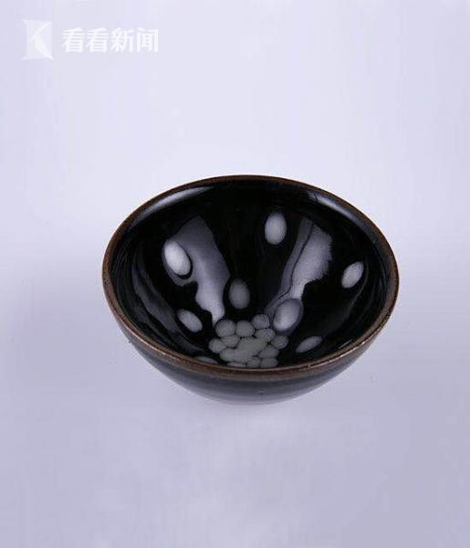 此外,还有一件宋建窑鹧鸪盏。宋建盏历来被古陶瓷界尊称为“未列入五大名窑却胜过名窑”,是宋时王公贵族斗茶品茗的首选。它产于福建建阳,在南宋时最为兴盛。那漆黑的碗底浮现颗颗饱满晶莹的珠粒,像极了鹧鸪胸部的白色斑点,因此而得名。