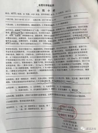 9月1日晚上11点,东莞厚街的周女士在博览大道南五路段步行回家,一辆黑色的小轿车突然窜出,将她撞倒在地。自认无大碍的她,同意司机提出的200元私了。岂料,第二天她腹部剧痛入院,却被发现整个内脏多处破裂、挫伤,一度下了病危通知书,住院近一个月花费约7万!