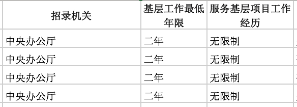 Tip:基层工作经历,是指具有在县级及以下党政机关、国有企事业单位、村(社区)组织及其他经济组织、社会组织等工作的经历。离校未就业高校毕业生到高校毕业生实习见习基地(该基地为基层单位)参加见习或者到企事业单位参与项目研究的经历,可视为基层工作经历。在军队团和相当于团以下单位工作的经历,退役士兵在军队服现役的经历,可视为基层工作经历。报考中央机关的人员,曾在市(地)直属机关工作的经历,也可视为基层工作经历。