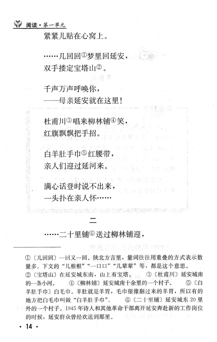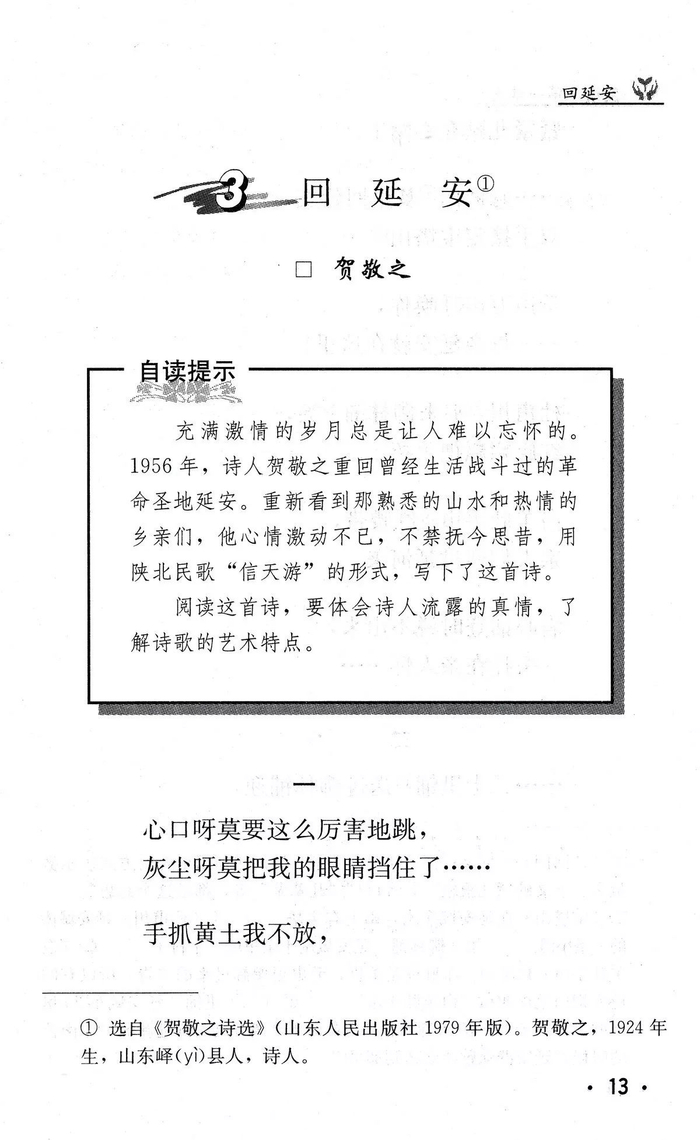 《回延安》曾经是那个火红时代的强音,感染过千千万万读者。在这首诗里,贺敬之酣畅地抒发自己对延安母亲炽热的赤子情。全诗除了真切的感情构成了诗的畅射源外,就是诗人对陕北风土人情的意象组合描写,它更增添了这首诗的生活气息和乡土美感,以及从朴实中流出来的民族音乐般的美。
