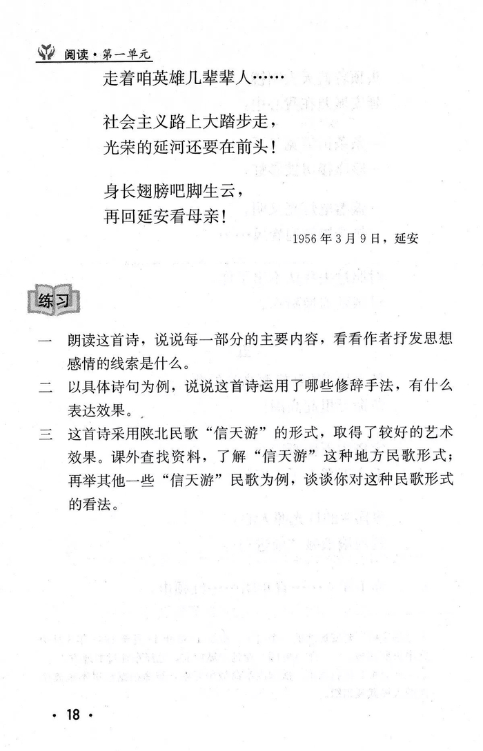 1956年,贺敬之回到阔别已久的延安,那是他曾生活多年的革命摇篮,魂牵梦绕的第二故乡,如今再一次见到它,感触万千,心潮澎湃,于是写下了这首激情洋溢、脍炙人口的政治抒情诗《回延安》。全诗有鲜明的抒情层次:先写回到延安时的兴奋和激动,再回忆当年在延安的战斗生活情景,接着抒写与延安亲人欢聚的感人场面,再写延安十年来的巨大变化,最后赞颂延安在革命进程中的重大功绩,并展望它的美好前程。