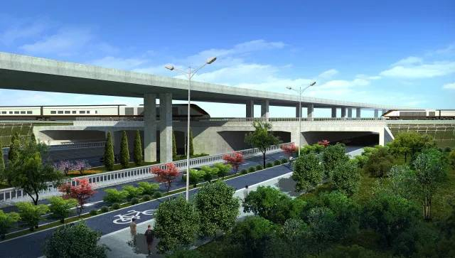 二环西南延与京沪高铁线相交,新建4孔箱涵下穿京沪铁路,地面高架下穿京沪高铁联络线。保障铁路正常运营的前提下,同时进行双向八车道的地面道路和上跨铁路六车道的高架路施工,高架路上下一列列高铁飞驰而过!