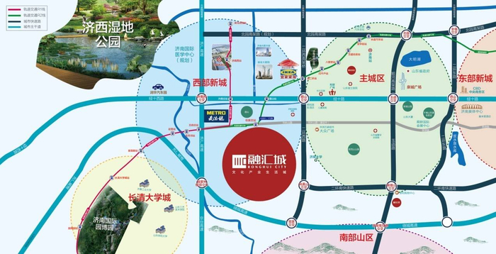 融汇城崛起济南充满发展潜力的西部新城南部生态居住板块,以产业为依托、地产为载体,涵盖文创产业集群、智慧教育新城、国际人居住区、环山生态公园四大功能分区为一体,是一座具有城市复合功能的产业生活大城,以高度契合济南城发展理念的姿态崛起于泉城西南。