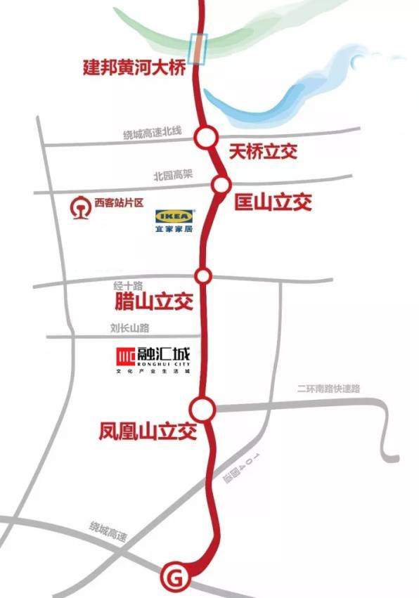 二环西南延高架路南接党家庄立交与绕城高速南线互通;北连腊山立交、二环西高架北段,直通天桥立交与绕城高速北线相连,成为第一条纵贯城市南北的快速通道。