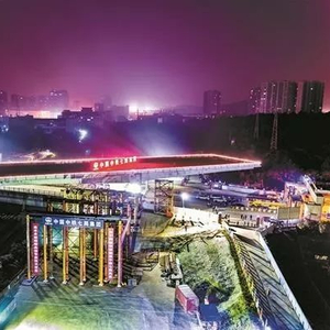 10月27日零点40分,这一路段交通中断,转体开始:长119.35米、重3350吨的钢箱梁,顺时针旋转100度,与高架主体完成精准对接。凌晨2点30分,交通恢复。到第二天下午,相邻一段桥体的顶推工程也顺利完成。
