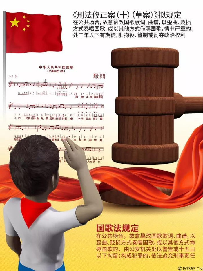 昨天,《中华人民共和国刑法修正案(十)》草案提交全国人大常委会第三十次会议审议,拟明确侮辱国歌行为的刑事责任。