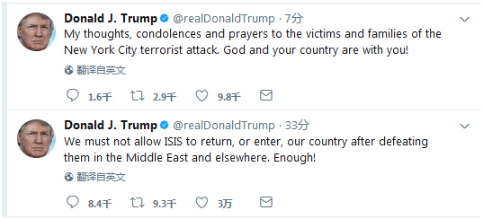 “向纽约恐袭的遇难者及其家属表达我的思念、哀悼和祈祷。”美国总统在纽约恐袭后发布推文表示,在击败中东或其他地方“伊斯兰国”(IS)恐怖组织后,不会允许其进入美国本土。