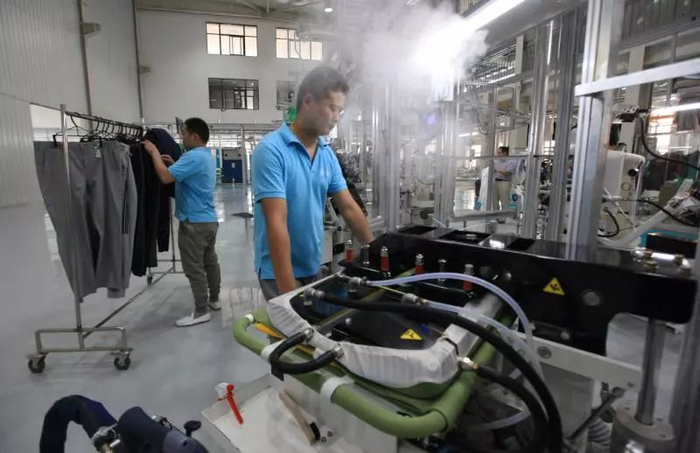 在熨烫设备区可以看到,熨烫工人熟练地将一件衬衣挂在专门的服装整形机上,再将设备开关打开,衬衣的干燥、吹烫、定型就会一次性全部完成,而整个过程只用了仅30秒的时间。