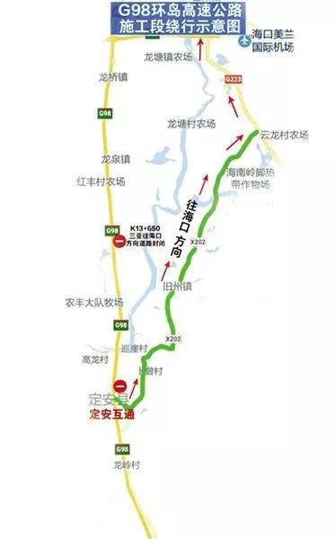 (一)2017年11月2日,封闭G98高速公路K13+650左幅(三亚往海口方向)施工5小时(具体起始时间待定)。由定安往海口方向途经该路段的车辆,请选择由G98定安互通、省道X202、国道G223、海口市区绕行。