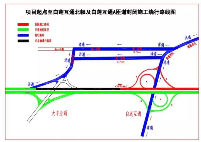 2017年11月1日至2017年11月30日,对白莲互通北半幅(含上下高速匝道)进行封闭施工,由东向西往G98西线高速、洋浦方向车辆由大丰互通(或福山互通)上高速,绕行路线如下:由老城镇南一环路→金马大道→大丰互通上高速前往G98西线高速、洋浦,或继续沿G225海榆西线→福山互通上高速前往G98西线高速、洋浦。