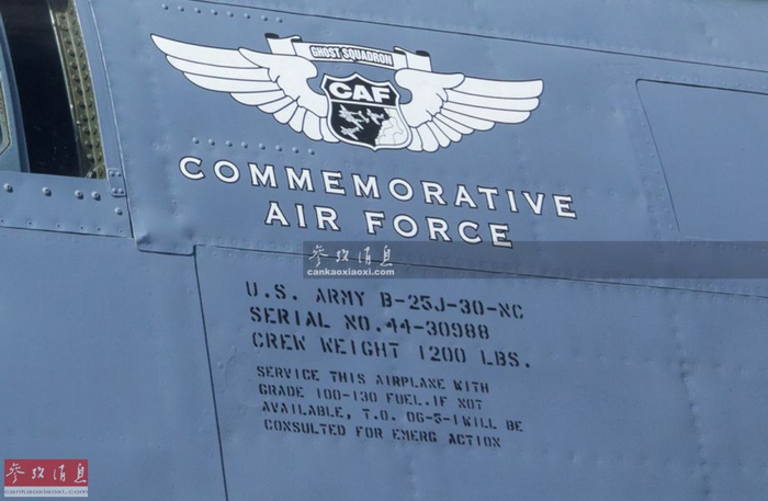 图为PBJ-1J机身上的生产铭牌特写 ,可见“美国陆军 B-25J-30-NC,生产序号44-30988”等信息。上方的CAF是美国民间航空团体“纪念空军”(Commemorative Air Force)的标志,专门收集二战老飞机修复,并巡游各州飞行表演。