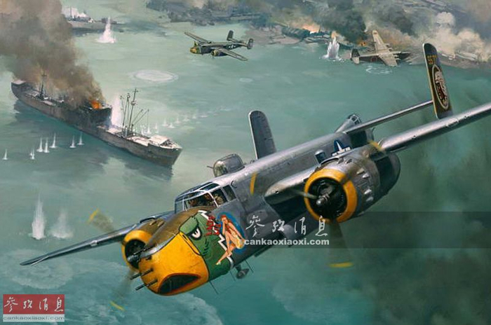 和常规型B-25不同,B-25J炮艇机在攻击日军运输船时通常会采用低空掠海扫射战法,由于火力全部布置在机头,可以像战斗机一样对同一目标,进行多次穿梭扫射攻击,用密集弹幕打到将日军舰船击沉为止。据幸存的日军回忆说,这种战机给他们造成了严重的心理阴影。图为艺术家绘制的美军B-25J炮艇机轰炸日军运输船油画。