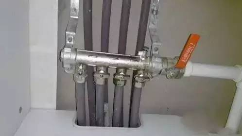 4、每一根分水管都要放水,先把总阀关上,分水管从左往右开始放水,第一个分水管的小水阀不动,第二根到第四根小水阀向右扭转90度,都关上,只放第一跟分水管的水。