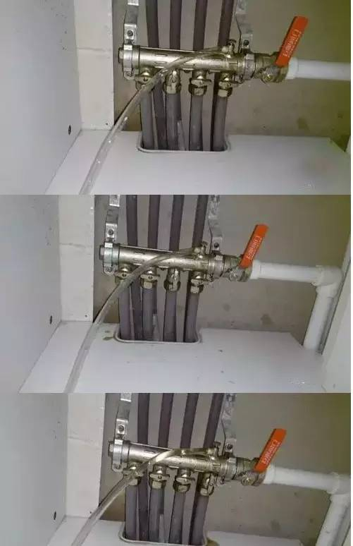 7、第一根分水管结束,小水阀关闭,开始放第二根,扭开第二根分水管的小水阀,依次放水直到全部。