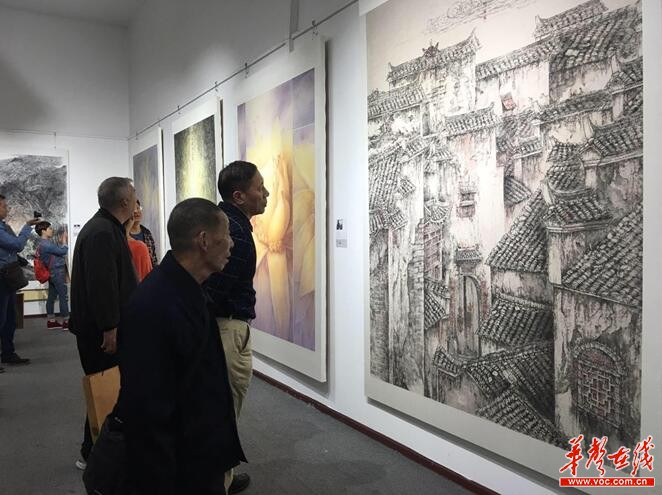 11月1日,湖南国画馆。展览上一幅题为《故乡云》的作品,吸引了众人驻足观看。浓淡相宜的笔墨、徽派的明清古建筑、青黑色的砖瓦、窗雕上呼之欲出的花鸟、略带沧桑感的美学意境……“我的老家在永州江永,从小在老房子里长大,我想用国画的手法呈现家乡美。”萧剑学生、创作者黄海明说,《故乡云》历时四个月完成。“离开家乡,总会在某个时刻不经意想起它,我想透过这幅作品,传递那股浓浓的挥之不去的乡愁。” 这次展览中,他从11幅作品中挑选出五幅作品参展,大多以山水、花鸟为主题。