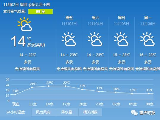 重庆市气象台2017年11月2日6时55分发布“大雾黄色预警信号”。预计11月2日7时到11时,我市渝中、大渡口、江北、九龙坡、南岸、沙坪坝、渝北、巴南、北碚、潼南、大足、荣昌、合川、永川、铜梁、璧山、江津、长寿、涪陵、垫江、忠县、丰都、梁平等地将出现能见度小于500米的雾,部分地区能见度小于100米,请以上各地注意预防大雾天气可能造成的危害。防御指南:1、大雾使空气质量明显降低,居民需适当防护;2、由于能见度较低,驾驶人员应控制速度,确保安全;3、机场、高速公路、轮渡码头采取措施,保障交通安全。