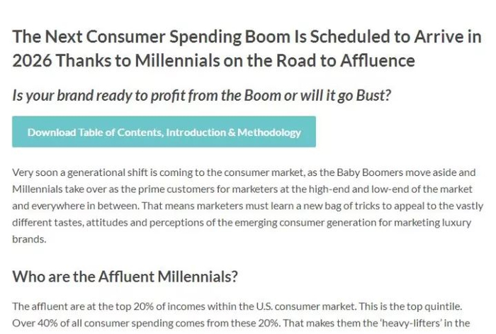 Unity Marketing的一份研究报告显示,从2015年起,全世界的千禧一代在奢侈品消费中的比例逐渐升高。预计到2026年,千禧一代将贡献奢侈品消费的65%,成为绝对的主力顾客群。
