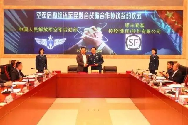10月23日,空军后勤部在北京与顺丰集团、中铁快运股份有限公司、中国邮政速递物流股份有限公司、德邦物流、京东物流5家地方优质物流公司和中国物流与采购联合会共同签署了《空军后勤物流军民融合战略合作协议》。