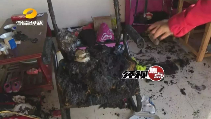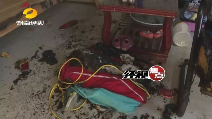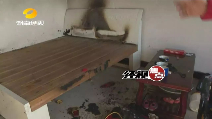 记者在常德汉寿县的事发现场,发生火灾的地方也就是这个房间,而当时瞿先生一家四口正在床上睡觉,床上烧毁的被子已经被清理,但是在床边我们可以看到一个枕头,烧焦严重,这把椅子原本也是放在床边的,已经烧成了焦块,再看到这个房间,屋顶都已经被熏黑,当时的火势也并不小。