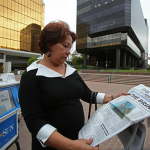 资料图片:2012年7月12日,在美国加利福尼亚州圣贝纳迪诺市市政厅门前,一名妇女在看报。新华社发