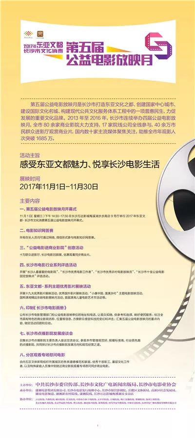 为吸引更多的观众走进电影院、爱上看电影,长沙市文广新局推出2017年东亚文都·长沙市文化消费第五届公益电影放映月“优惠观看同步商业片”活动。