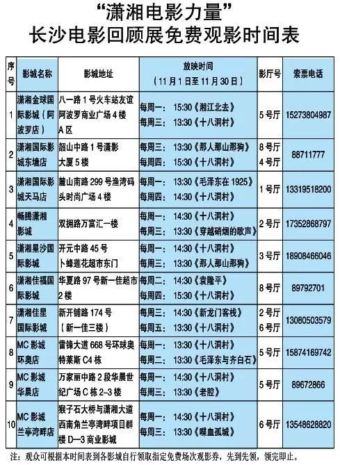 11月1日至11月30日,联合潇湘电影集团有限公司,组织潇湘院线加盟的10家影院每周专场放映潇影集团所拍摄的影片,观众可免费观看。