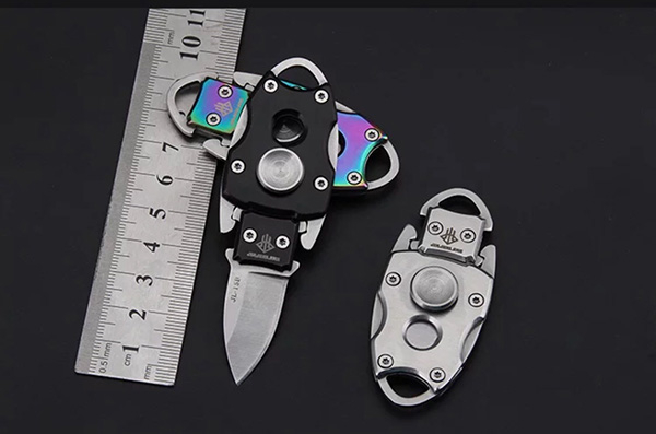 还有的指尖陀螺直接做成了隐藏式刀具。在某网店中,该产品的宣传语为“我是陀螺,也是小刀”、“掌中小刀,非管制刀具符合国家规定”。在其展示的商品视频中,这个陀螺经过拆卸组装之后变成锋利的刀具,且变成刀具后仍可以当作陀螺进行高速旋转。该产品信息显示,陀螺总长6.5厘米,刀刃打开长度为9.3厘米,刃宽1.5厘米,在卖家发布的一段视频中,这把陀螺刀可以轻易削下水果的表皮。有买家评论称“刀很锋利,不过小割手”。