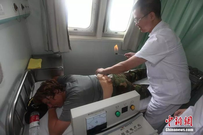 “岱山岛”号医院船满载排水量14000余吨,最高时速20节,续航距离为5,000海里。“岱山岛”船医疗设施完备,装备先进,船上有电脑断层扫描室、数字X线摄影室等医疗系统,共有217种、2,406(台)套;拥有各类型病床约300张;船上设有远程医疗会诊系统。图为2013年7月14日,荷兰护航舰艇“范·斯派克”号8名舰员登上中国海军医院船。荷兰“范·斯派克”舰麻醉师亨迪克斯上校在医院船体验中医拔火罐。中新社记者 琚振华 摄