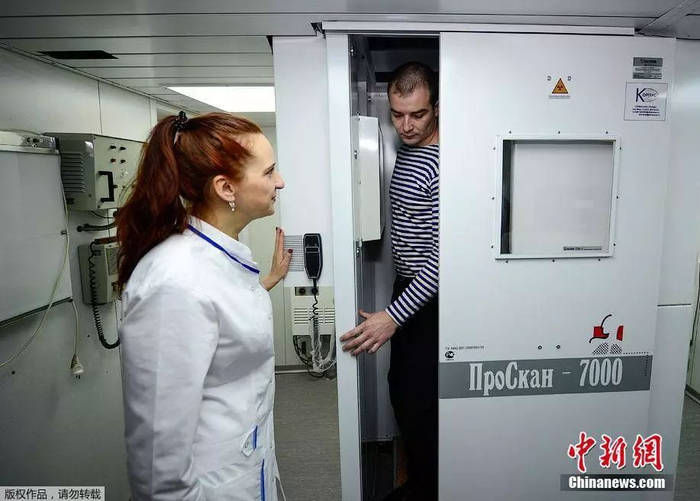 该船排水量11,300吨,速度19.8节,续航力约为8690海里,船员207人。图为俄罗斯海军士兵在俄罗斯“额尔齐斯河”号医院船上接受X光检查。
