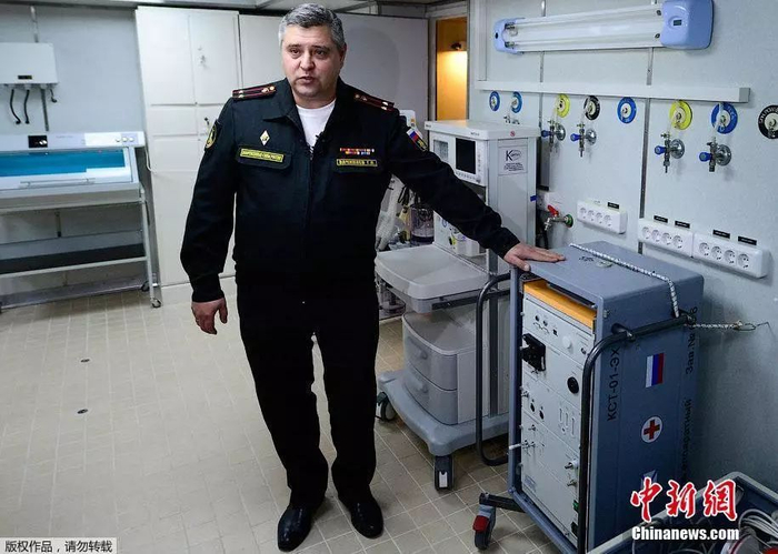 目前俄罗斯320型医院船“额尔齐斯河”号已经完成第二阶段现代化医疗设备安装,包括化验,麻醉设备,最新一代的生命支持系统,X线摄影和超声设备,以及现代外科手术和重症监护设备。图为俄罗斯海军军官在展示俄罗斯“额尔齐斯河”号医院船上的新设备。