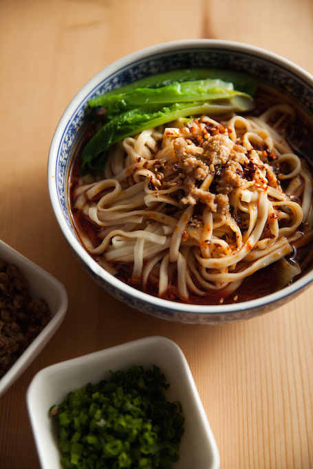 杂酱面是清晨小面里最叫座的,懂行的家一定用新鲜水切碱面,俗称叫棍棍面,表面微黄,吃起来筋道,拌面的杂酱是铁打不动的芝麻酱、汉源花椒面、猪肉臊子与辣椒油,再加些白糖、蒜泥、酱油之类,清早一闻就满口生津,搭配的菜色冬天是青菜夏天用泡豇豆,一碗下肚,鲜香爽脆。