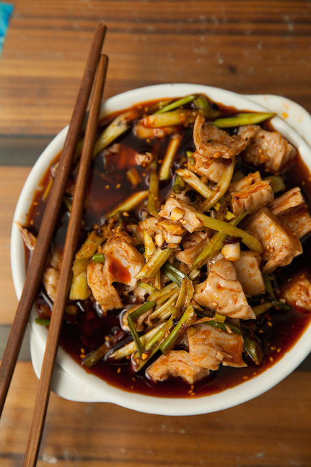 回锅肉的配菜也讲究,一定得是蒜苗。蒜苗对于回锅肉尤为重要,不仅气味芬芳,而且蒜苗叶子能充分吸收肉的油脂,自身也不失为难得的美味。回锅肉炒到起锅前,下蒜苗和特调酱油炒到断生,关火出锅,吃来才有蔬菜独特的鲜活之感,有时比盘里的肉更受欢迎。