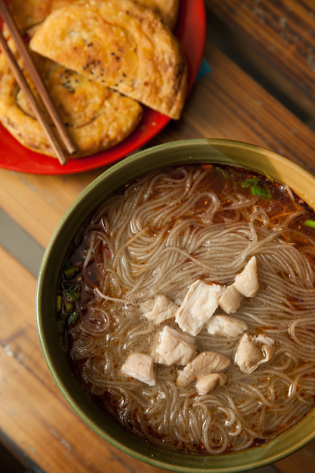粉要选优质红薯粉,最好是手工做出来的,口感才有劲道。调料要下足,酱料没得含糊,必须得是陈酿郫县豆瓣酱,香味才有层次,如此一碗下肚,绝对安逸。再来份脆脆的锅盔,手工打面,劲道喷香,泡汤更鲜,简直就是地道的平民美食。